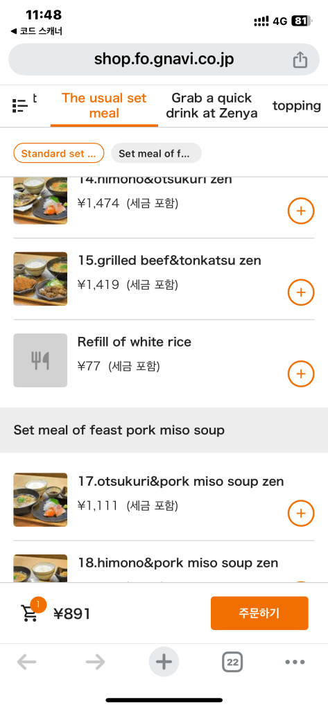 일본은 그런종류가 음식이 별로없다. 진짜로 돼기국밥이 먹고 싶지만 어쩔수 없지, 대신에 생선구이와돈지루( 일종의 야채와 돼기고기가 들어있다)가 맛있는 젠야에서 간단하게 먹는 걸로